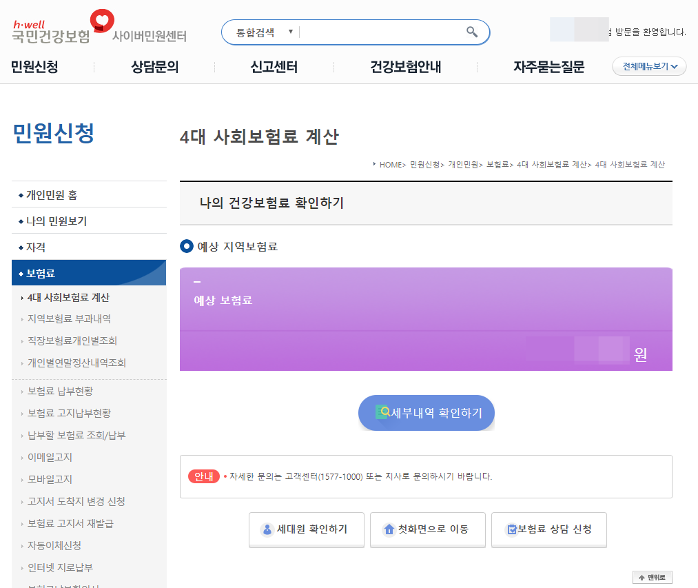 이렇게 조회되는 보험료는 세부내역 확인을 클릭하시면, 납부할 보험료의 산정기준도 확인이 가능하십니다