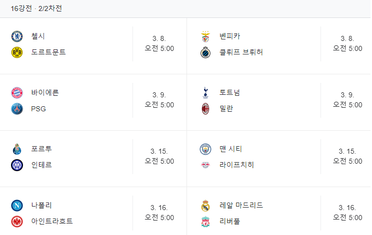 챔피언스리그 16강은 1차전, 2차전 다 새벽5시인게 좀 슬프긴하죠 ㅎ