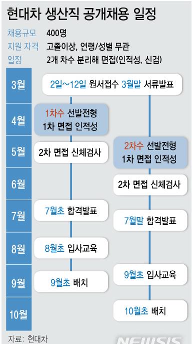 -현대차 생산직 채용일정은 3월 원서접수를 시작하여, 2차례의 면접을 거쳐, 7월초에 합격자발표를 한다.