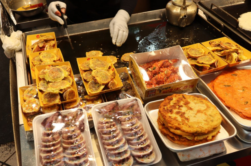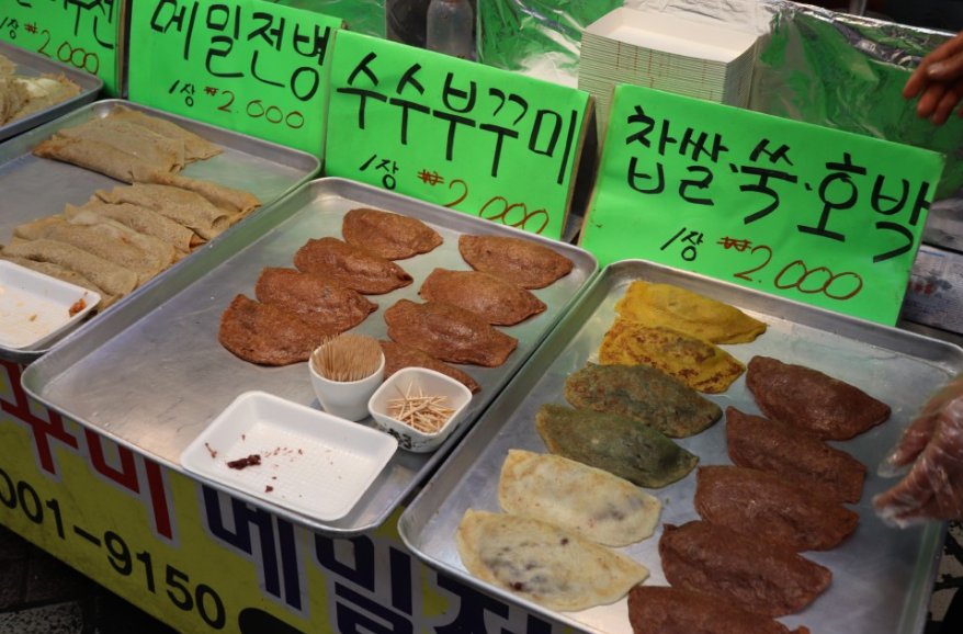오징어순대, 튀김, 메밀전병, 감자전, 술떡, 그리고 닭강정