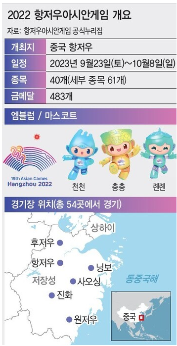 아시안게임은 원래 짝수해에 열리는데 코로나때문에 23년으로 연기되었고, 하지만 공식명칭으로 2022 항저우 아시안게임으로 불리게되죠.