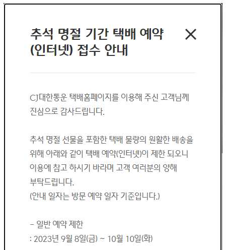 -CJ대한통운은 추석 때 미리 온라인택배 예약을 마감합니다.