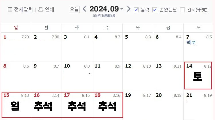 2024년에서 가장 긴연휴가 가능한 9/14(토)~9/18(수)까지 5일간 쉬는게 가능합니다.