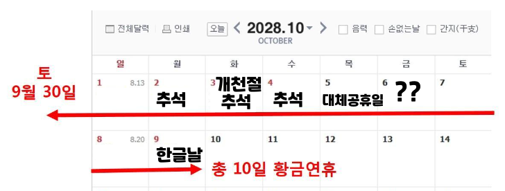 추석, 개천절, 한글날이 주르륵 이어지게 되구요.