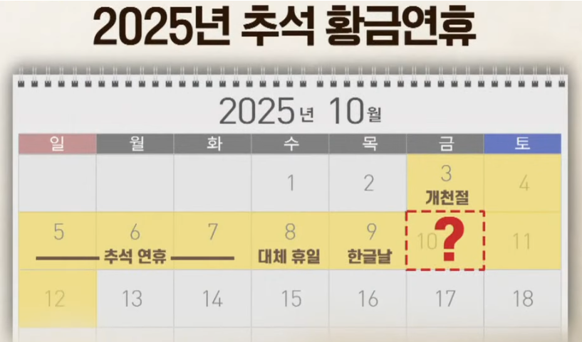 2025년은 개천절(10/3.토), 추석연휴(9/5.일~9/8.목), 한글날(10/9.목)이 다 같이 이어지는 특이한 주간이죠.