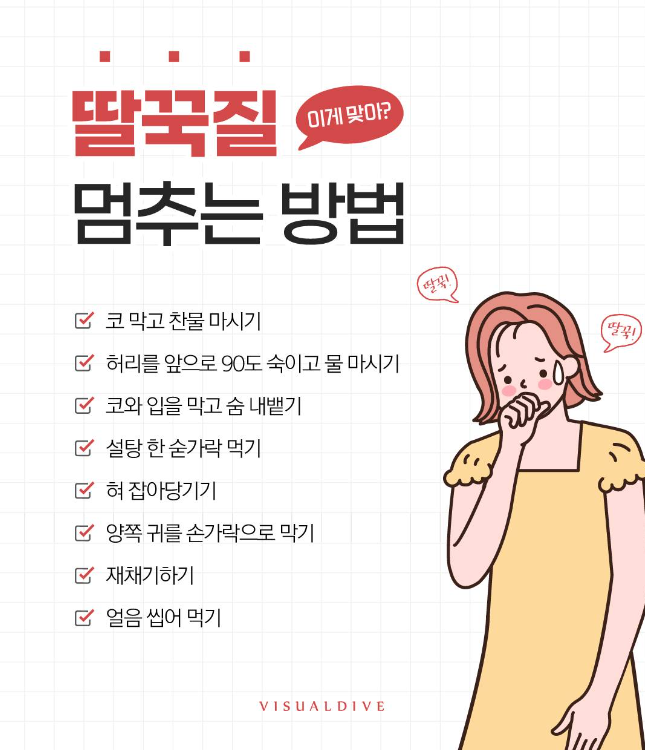 저마다 딸꾹질을 멈추는 개인적인 방법들이 있을텐데 아래는 일반적인 방법들이다.