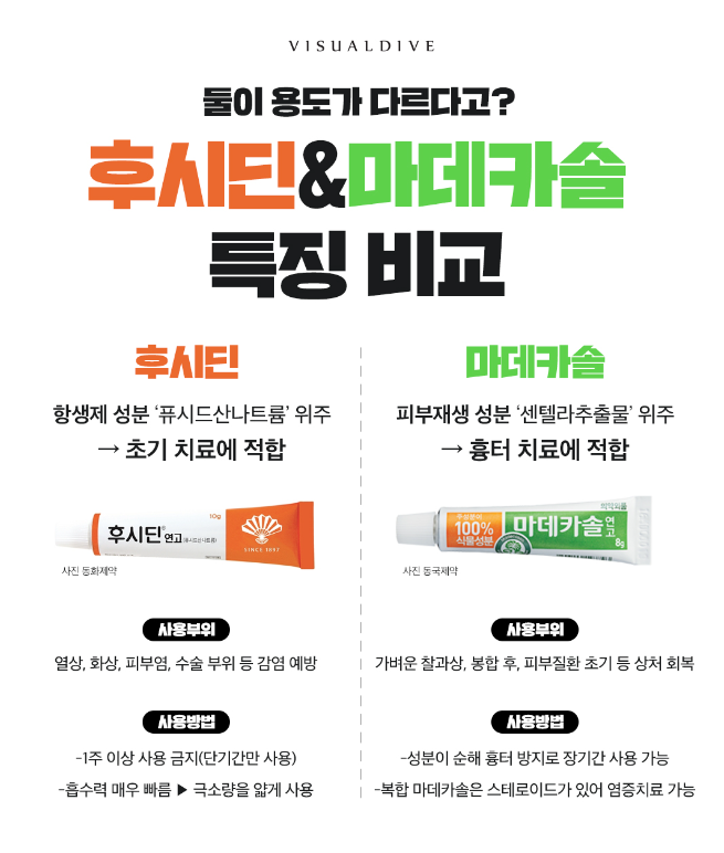 후시딘과 마데카솔 특징 차이점을 간단히 그림으로 살펴보자 . 바로 이해가 된다.